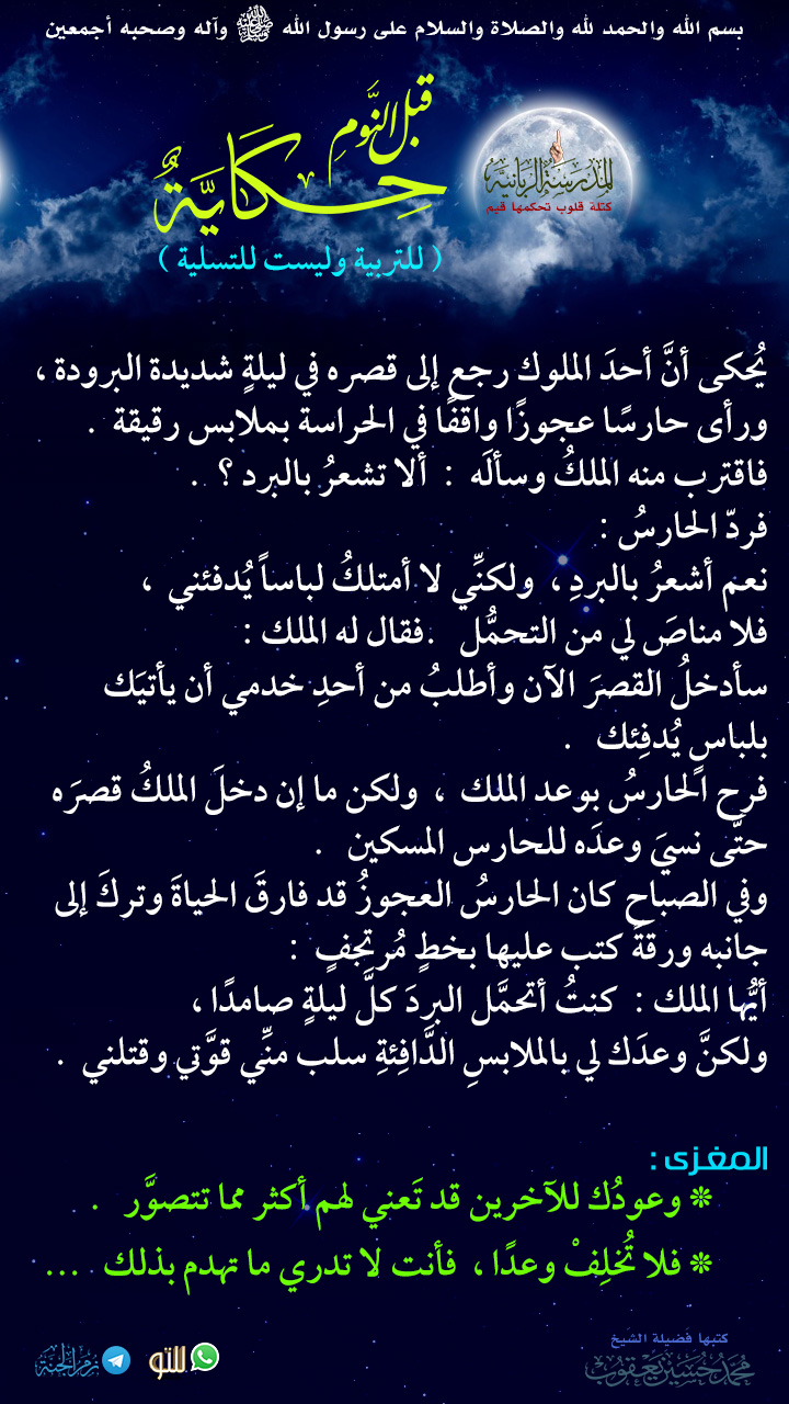 ضرب الله مثلا صراطا مستقيما، وعلى جنبتي الصراط سوران فيهما أبواب مفتحة، وعلى الأبواب ستور مرخاة، وعلى باب الصراط داع يقول: يا أيها الناس، ادخلوا الصراط جميعا ولا تعوجوا، وداع يدعو من فوق الصراط، فإذا أراد الإنسان أن يفتح شيئا من تلك الأبواب، .. مسجد : المدينة المنورة - بلبيس - الشرقية - 11-1-2013 -